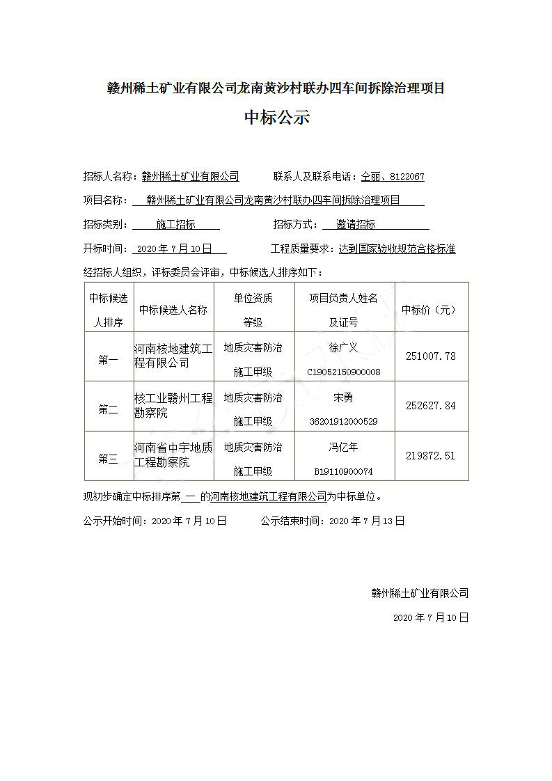 赣州稀土矿业有限公司龙南黄沙村联办四车间拆除治理项目中标公示